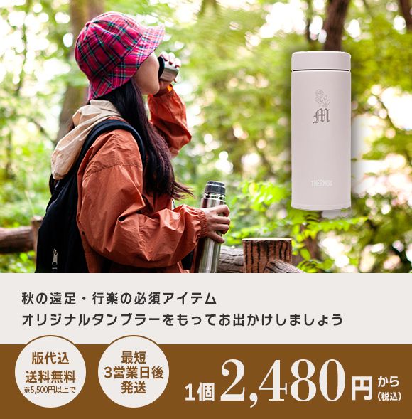 自然を満喫する必須アイテム、 オリジナルタンブラーをもってお出かけしましょう 秋の遠足や行楽に欠かせない必須アイテム 「タンブラー」 レーザー彫刻は、印刷に比べて耐久性も高く 永くお使いいただけるのでオススメです! \ あなただけの特別なマイボトルホルダー / 【短納期】ペットボトルホルダー ストラップ付 500〜650ml用 2,720 円(税込) / 1個のとき 商品ページを見る \ 持ち運びにうれしいサイズ感 / 【短納期】サーモス 真空断熱ケータイマグ 350ml 3,930 円(税込) / 1個のとき 商品ページを見る \ 勉強や読書のおともに / 【短納期】スクリューボトル 520ml 2,940 円(税込) / 1個のとき 商品ページを見る