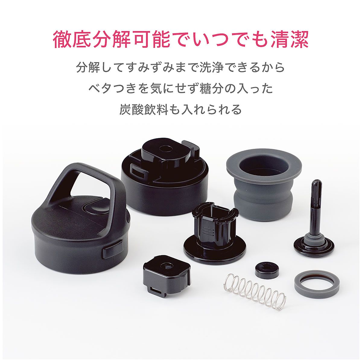 真空断熱構造+銅メッキ加工で保冷効果が長持ちする、保冷専用炭酸用ボトルです。中栓を分解して徹底洗浄できるから糖分の入った炭酸飲料も入れられます。ワンプッシュで簡単圧抜きができたり、クリーンミラー加工で泡立ちにくく、ニオイや汚れもつきにくい、持ち手付きで持ち運びに便利など、こだわりの仕様となっています。サビに強いSUS316ステンレス鋼使用でスポーツ飲料にも対応しており、スポーツシーンに活用いただけます。